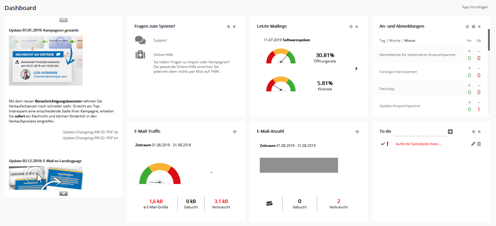 Mit der Funktion 'Apps hinzufügen' können Sie Ihr Dashboard mit verschiedenen kleinen Übersichtsfenstern verschönern, wie zum Beispiel 'An- und Abmeldungen' und die 'Zuletzt bearbeiteten Elemente'. Dafür brauchen Sie nur die gewünschten Elemente auf Ihren Dashboard hinzufügen. Mit der App 'Letzte Versendungen' gelangen Sie außerdem einen Klick direkt zu der Statistik des Mailings.
