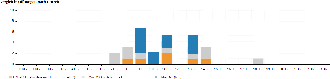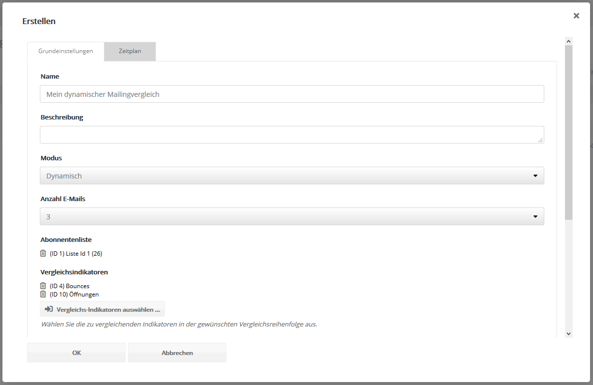 • dynamisch: Vergleichen Sie den Verlauf der letzten Mailings, die an eine bestimmte Abonnentenliste verschickt wurden.