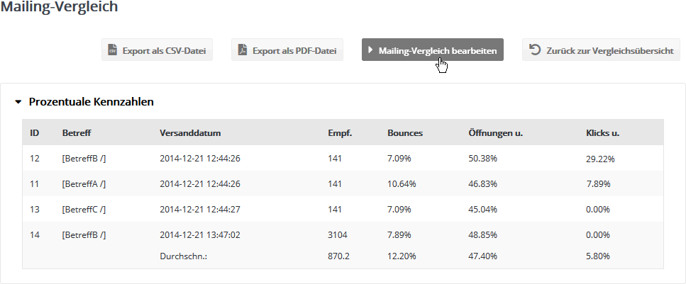 In der Ergebnis-Anzeige haben Sie über die entsprechenden Buttons die Möglichkeit, die Daten des Mailing-Vergleichs wahlweise als CSV-Datei oder im zuvor gewählten Report-Design als PDF-Datei herunterzuladen, sowie die Einstellungen des Mailing-Vergleichs noch einmal zu bearbeiten.