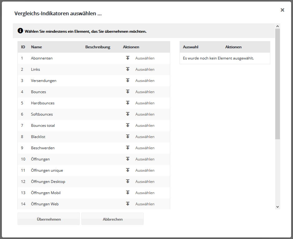 Wählen Sie die gewünschten Vergleichs-Indikatoren aus, z.B. die Zahl der Öffnungen und Abmeldungen. Die Reihenfolge bei der Auswahl entspricht dabei der späteren Darstellung im Vergleichs-Report.