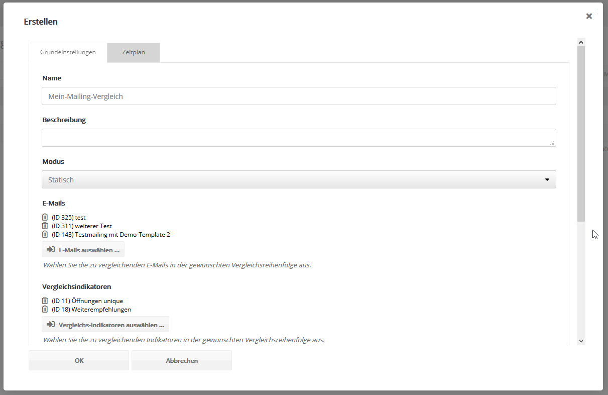 Zum Anlegen eines neuen Mailingvergleichs klicken Sie oben rechts auf 'Neuer Mailingvergleich'. Geben Sie den gewünschten Namen und optional eine Beschreibung ein.