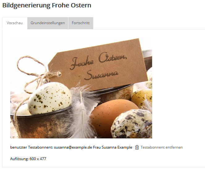 Im Reiter 'Vorschau' legen Sie einen Testabonnenten an, mit dem Sie den personalisierten Text testen möchten. Nachdem Sie Ihr Motiv im Mailing über einen Testversand oder besser mehrere Testversands getestet haben, können Sie wieder in den Bereich 'Bildgenerierung' wechseln. Unter dem Reiter 'Fortschritt' können Sie mit den Button 'Gen. starten' die Generierung Ihrer Bilder durchführen.