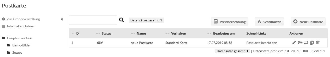 In diesem Bereich gestalten Sie Ihre eigene Postkarte. Hier gelangen Sie zu den Optionen Preisberechnung, Schriftarten und neue Postkarte erstellen.