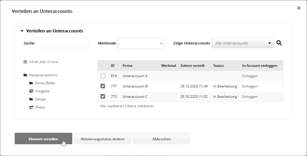Nach Klick auf das Verteilen-Symbol wählen Sie die Accounts, in die das Element verteilt werden soll.