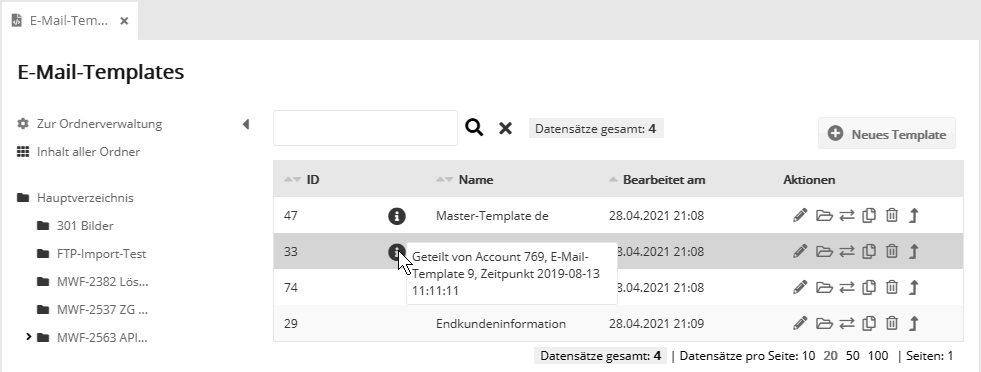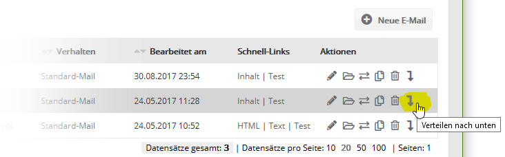 In den Übersichten von E-Mails, Templates, Kamapgnen und überall dort, wo sich Elemente verteilen lassen, finden Sie in der Spalte 'Aktionen' ein Pfeil-Symbol zum Verteilen.