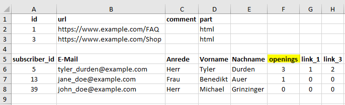 • Darunter finden Sie eine Liste aller exportierten Abonnenten. Diese Liste enthält sowohl alle Abonnentendaten als auch Details zu den Öffnungen Ihres Mailings ('openings') und den Klicks bezogen auf die in der Legende aufgeführten Links ('link_1', 'link_2', 'link_3', ...).