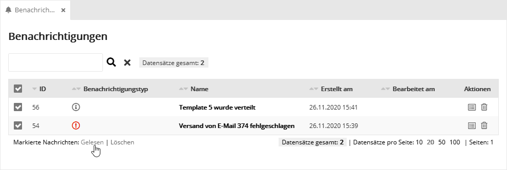In der Übersicht werden alle Nachrichten angezeigt. Ausgewählte Nachrichten lassen sich als "gelesen" markieren oder löschen.