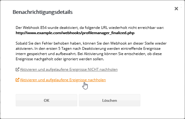 Möchten Sie einen WebHook wieder aktivieren, öffnen Sie die Nachricht und klicken Sie den gewünschten Aktivierungs-Link an. Dabei können Sie entscheiden, ob die in den ersten 5 Tagen nach Deaktivierung aufgelaufenen Ereignisse nachgeholt werden sollen..