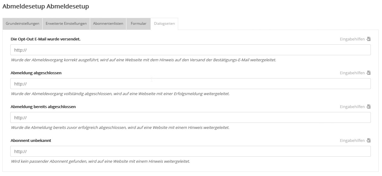 Zur Erklärung: Ein Abonnent wird nach erfolgreicher beziehungsweise fehlerhafter Eingabe seiner Daten zu einer entsprechenden Antwort-Seite geleitet, um zum Beispiel die Meldung 'Ihre Anmeldung war erfolgreich' zu erhalten. Füllen Sie diese Felder nicht aus, werden Standard-Seiten von mailingwerk verwendet. Möchten Sie aber eigene Seiten anzeigen lassen, geben Sie die URLs Ihrer Webseiten in den Feldern an. Alternativ bietet mailingwerk die Erstellung von Dialogseiten auf Basis Ihres Corporate Designs an. |