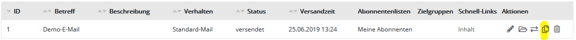 Archivmailing erneut versendenSie möchten ein bereits versendetes Mailing erneut versenden? Oder als Grundlage für die nächste Ausgabe einer Newsletter-Serie verwenden? Klicken Sie dazu auf das 'Kopieren'-Symbol des gewünschten Archivmailings:
