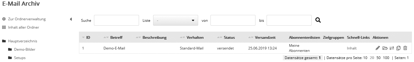 Im 'Archiv' finden Sie eine Übersicht aller abgeschlossenen Mailings. Dazu zählen Standardmailings (Status 'versendet') ebenso wie Dialog- und Kampagnenmailings, sobald sie abgebrochen wurden. Aus dem Archiv lässt sich jedes versendete Mailing in Kopie wiederherstellen und als Grundlage für ein zukünftiges Mailing verwenden, siehe Wiederherstellung einer E-Mail aus dem Archiv.
