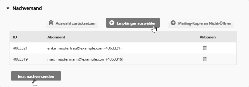Haben Sie alle Empfänger für den Nachversand ausgewählt, klicken Sie auf 'Jetzt nachversenden'. Damit startet der Nachversand. Die Nachversendungen werden gemeinsam mit den bisherigen Empfängern in der E-Mail-Statistik erfasst. Nachversand an alle Nicht-ÖffnerSie möchten die Nicht-Öffner eines versendeten Mailings erneut anschreiben? Öffnen Sie das gewünschte Archivmailing. Klicken Sie auf dem 'Versand'-Reiter im Bereich 'Nachversand' den Button 'Mailing-Kopie an Nicht-Öffner'.